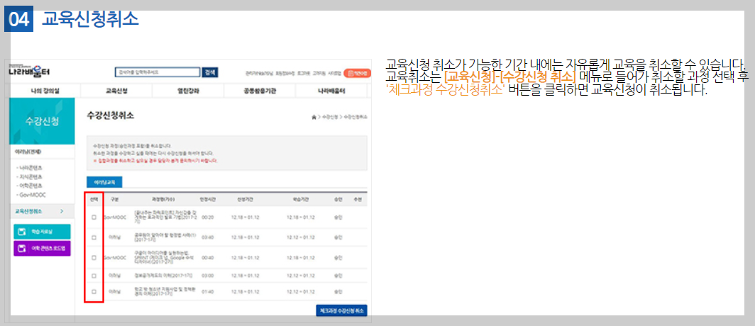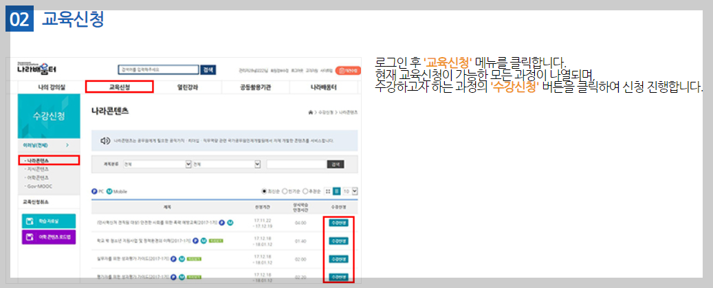 교육 신청 방법도 간단합니다. 교육일정을 확인한 후 원하는 교육 과정에 대해 신청하면 됩니다. 교육일정은 학습월을 현재 해당월로 설정하여 검색해야 하며, 이를 통해 현재 신청 가능한 교육들을 확인할 수 있습니다. 교육 신청 페이지에서는 수강신청 버튼이 활성화된 교육 과정들을 확인할 수 있으며, 여기서 원하는 교육 과정에 신청하면 됩니다. 다만, 민간인은 '나라콘텐츠'만 신청 가능하며, 공무원 전용 콘텐츠는 접근이 제한됩니다.