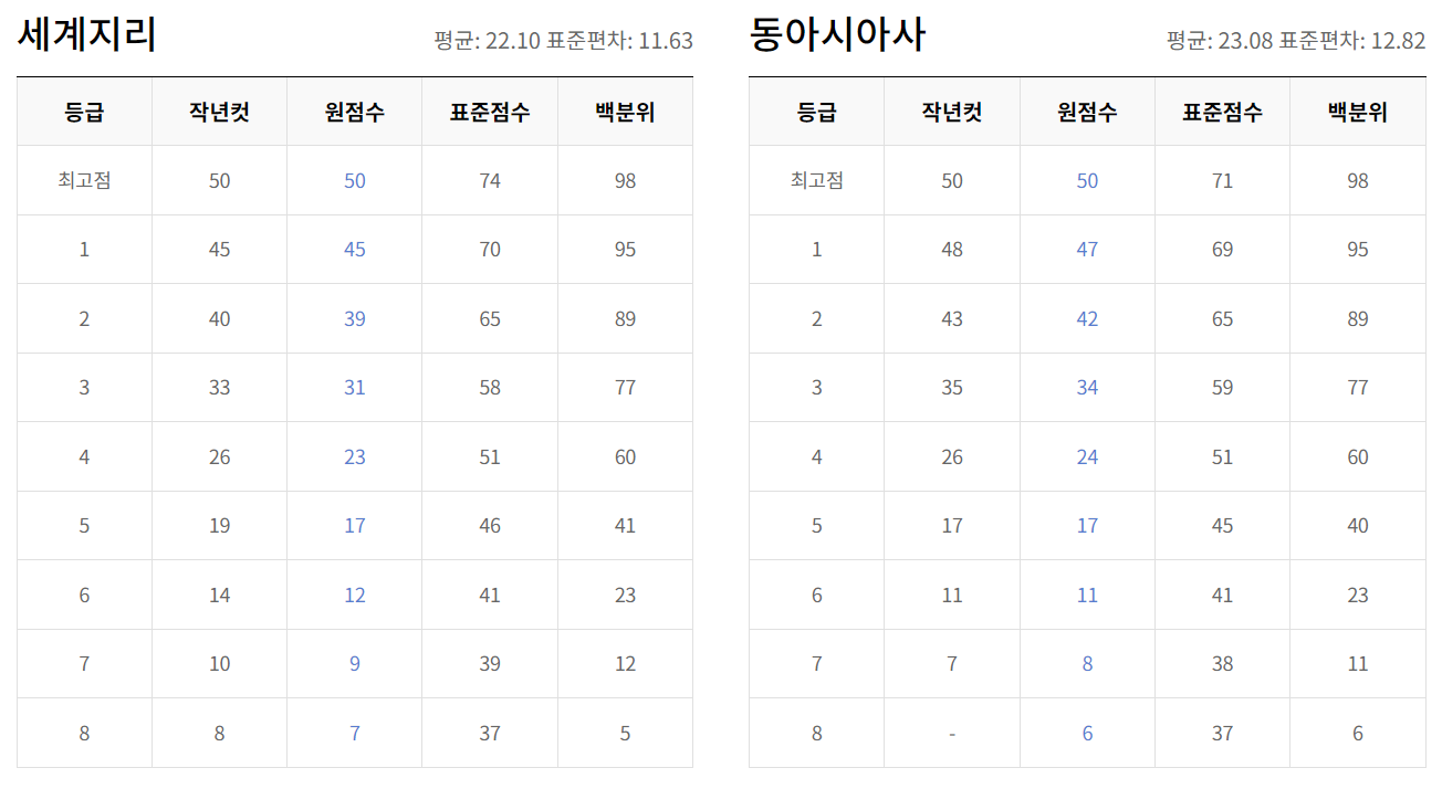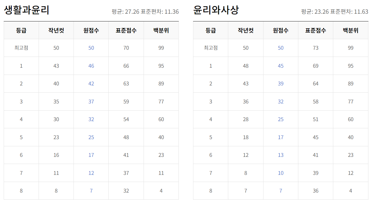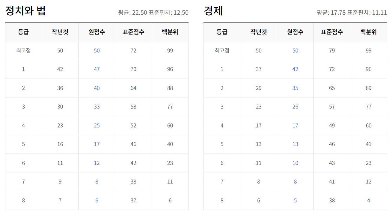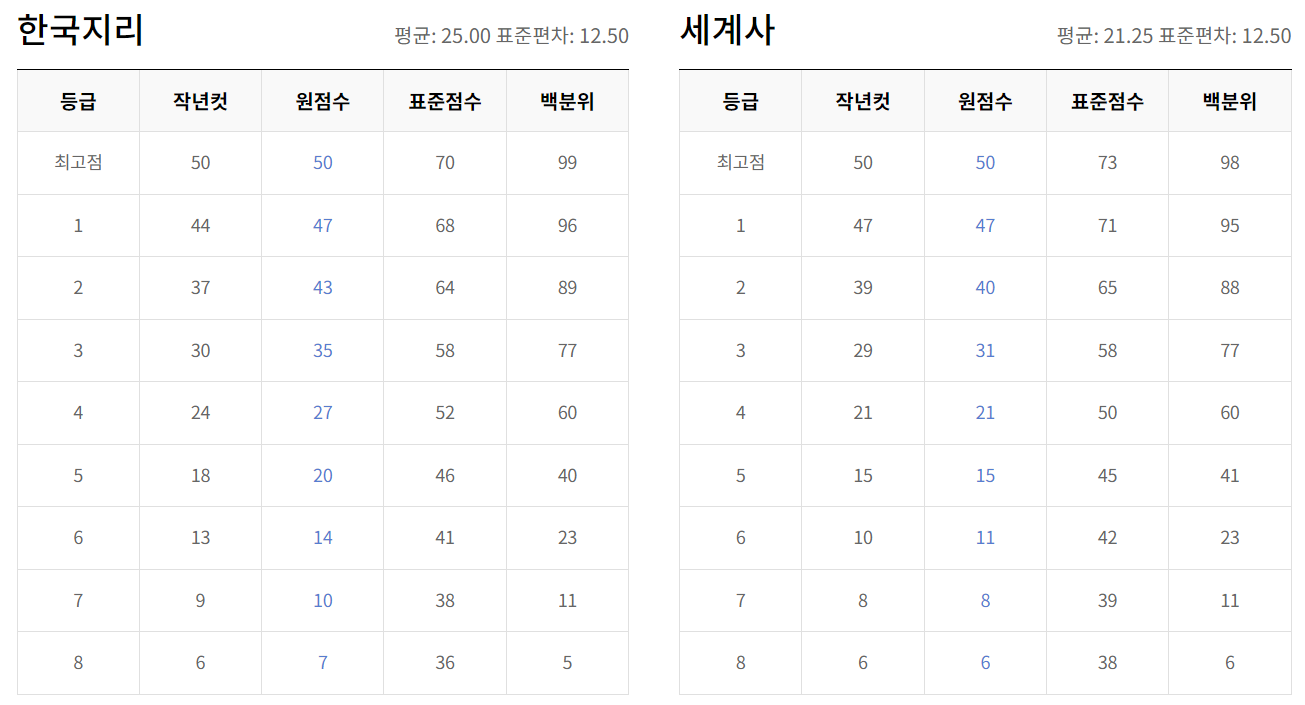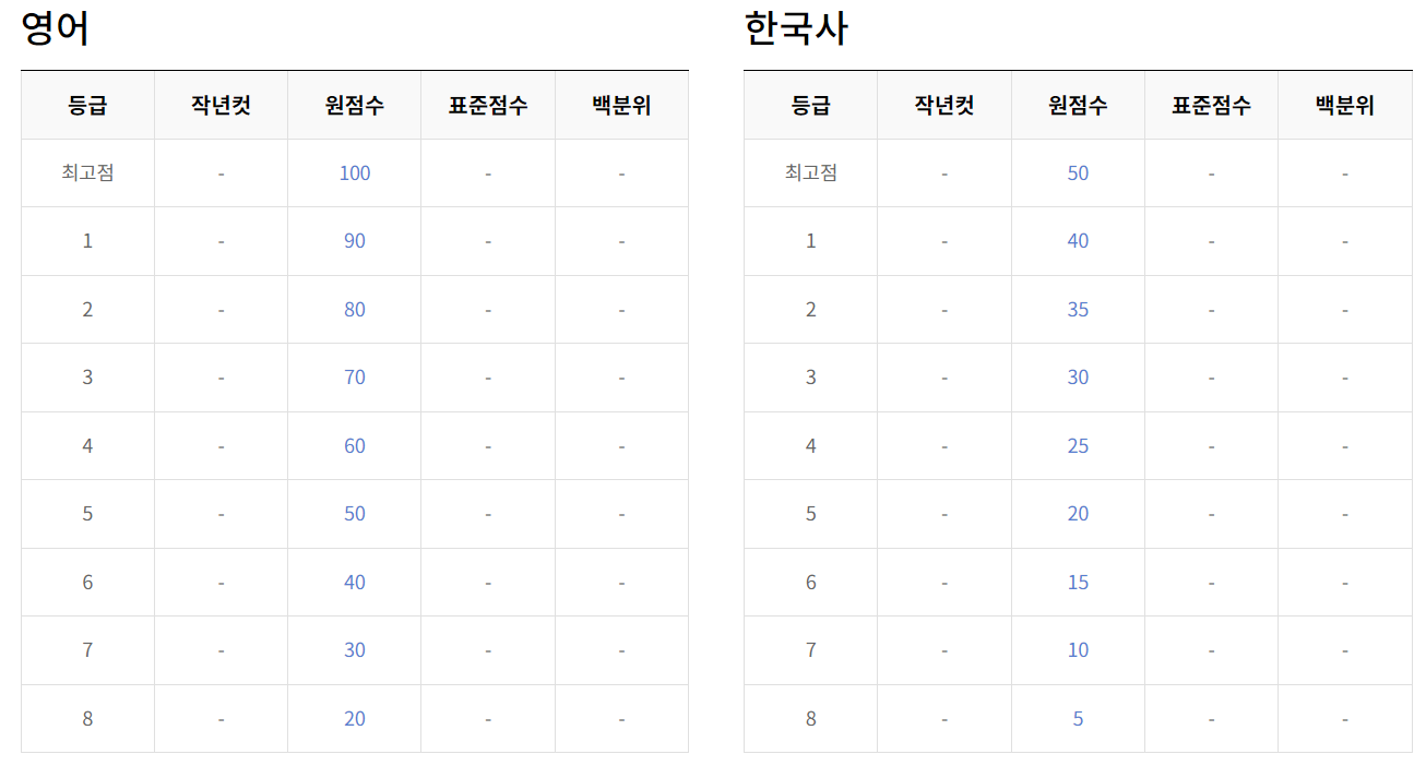 - 영어 & 한국사 : 이 두 과목은 절대평가로 진행되며, 영어는 만점이 100점, 한국사는 50점입니다.