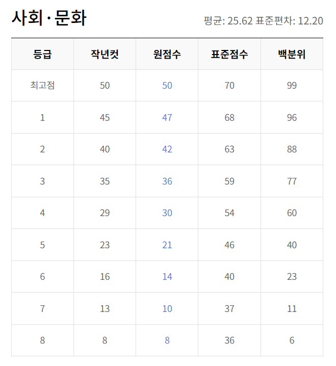 - 사회탐구 : 총 9개 과목으로 나누어지며 각 과목 만점은 50점입니다.