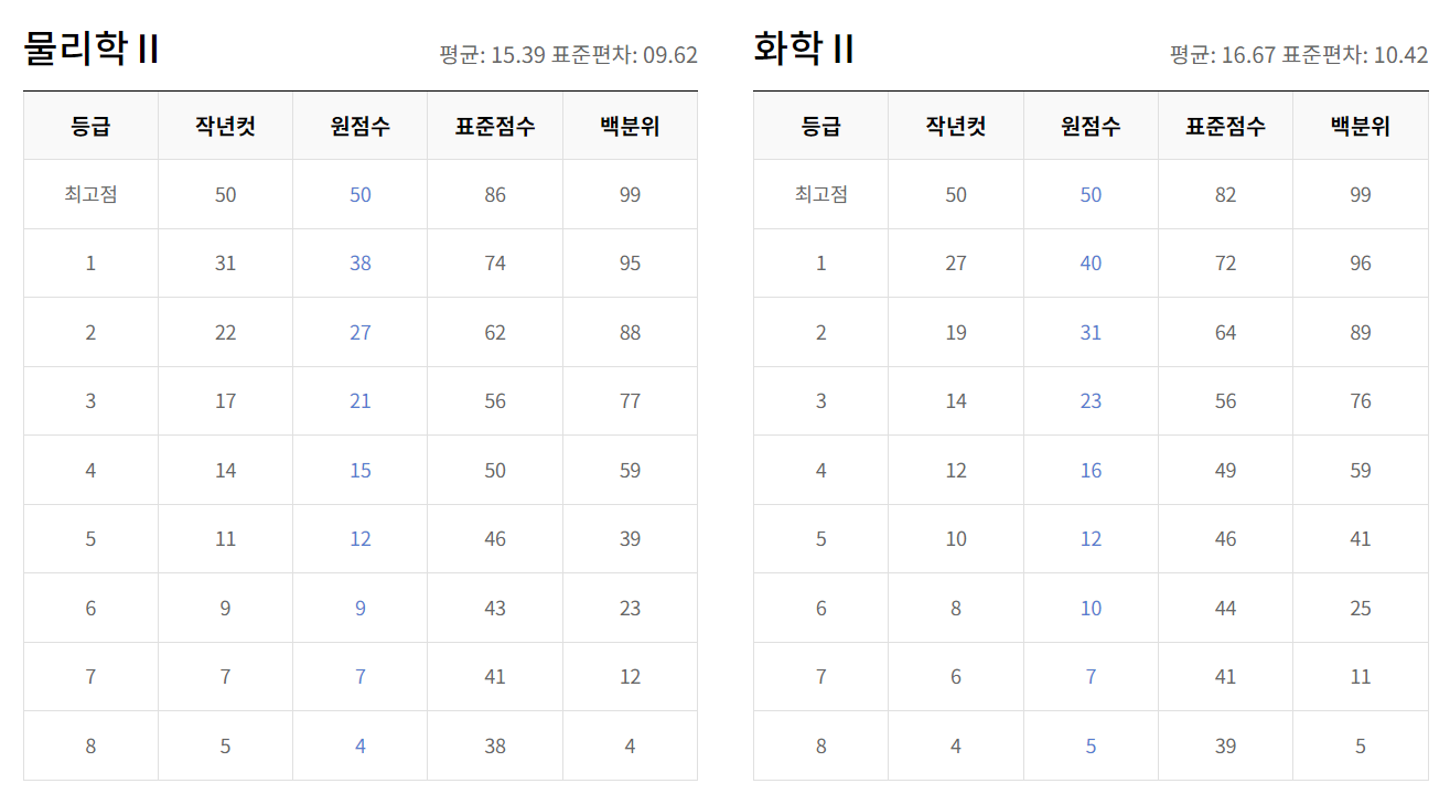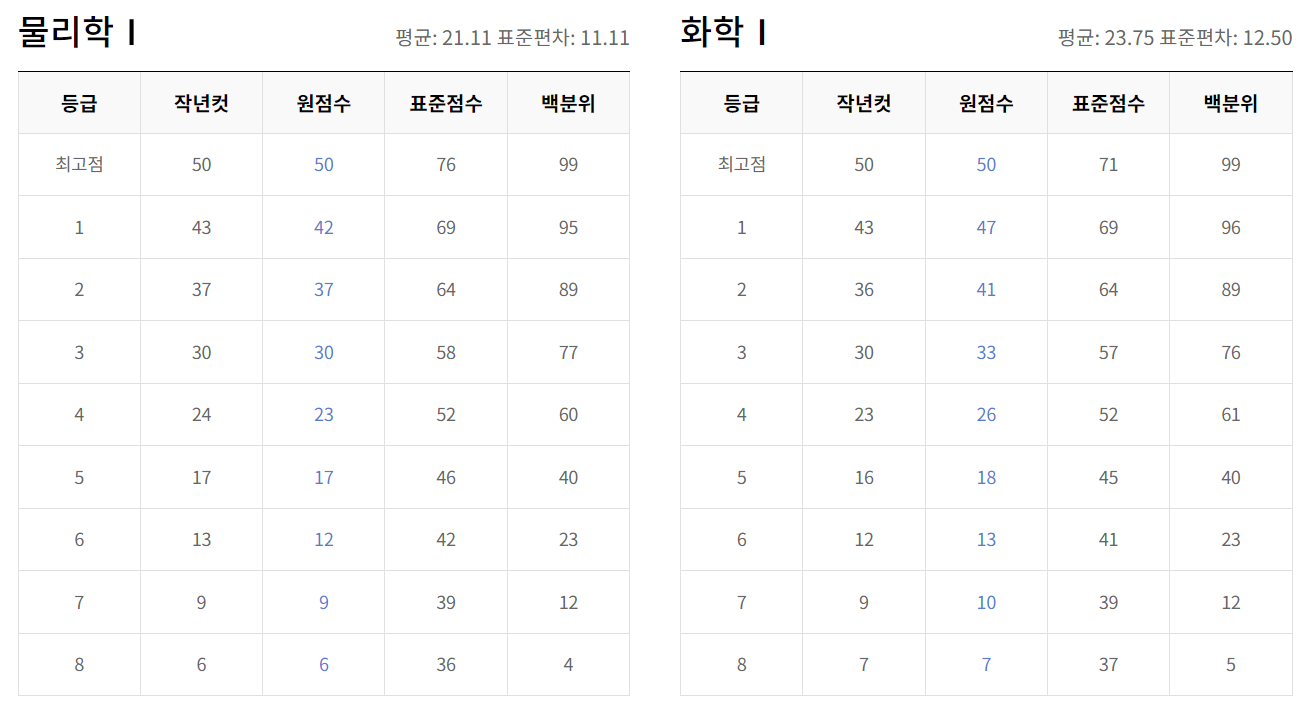 - 과학탐구 : 물리학 I·II, 화학 I·II, 생명과학 I·II, 지구과학 I·II 등 총 8개 과목으로 구성되며, 각 과목 만점 또한 50점입니다.